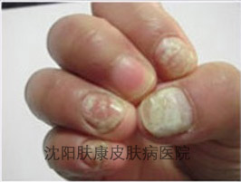 表现症状:先生由于经常到洗脚店洗脚,感染了脚气,由于没有引起重视疏于治疗,没过多久,又感染上了灰指甲。这几年经过多次芍物治疗,不但没有好转,反而逐渐扩展,手上被传染了8个灰指甲,脚上也被传染了4个趾甲。