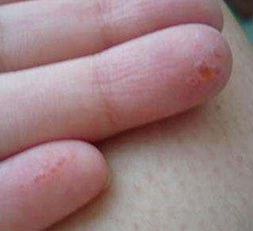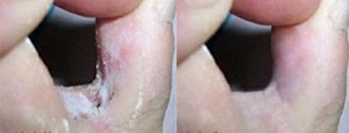 治疗前:手指间长水疱,蜕皮,严重引起的溃烂