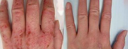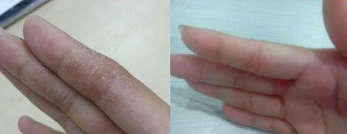 治疗前:手指间长水疱,蜕皮,皮肤增厚、开裂。